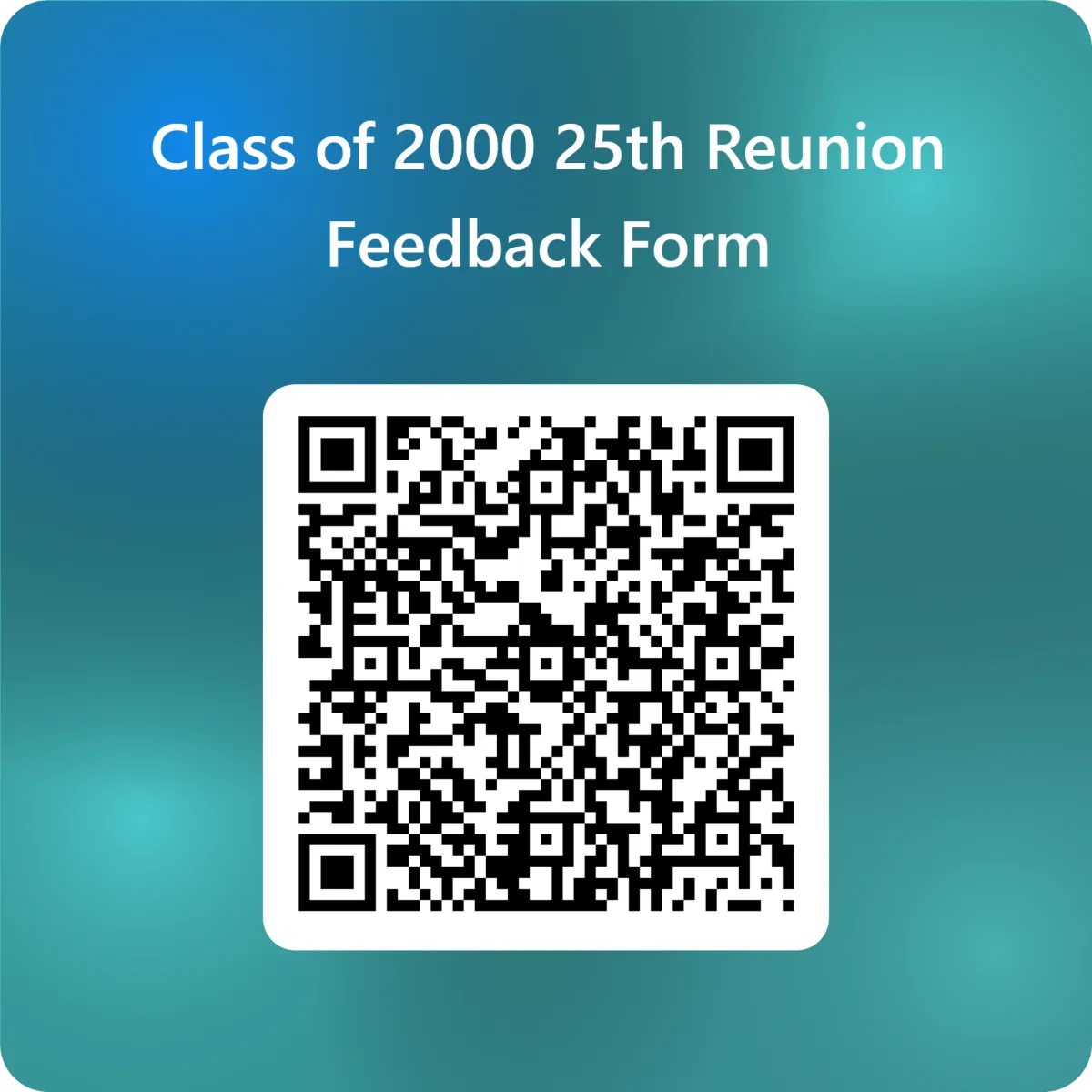 Thank you so much for coming to our 30 year reunion. We hope you enjoyed reconnecting and reminiscing with each other. Below you'll find the memories slideshow, a gallery of photos taken during the reunion, and a QR Code/ link to our Reunion Feedback Form. We hope you'll take a few minutes to complete this survey and help us improve future reunions.